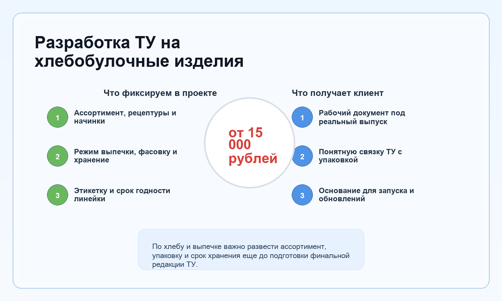 Отдельные технические условия обычно нужны тогда, когда производитель работает по собственной рецептуре, комбинирует несколько групп выпечки в одной линейке или хочет закрепить документом фактическую схему выпуска и маркировки.