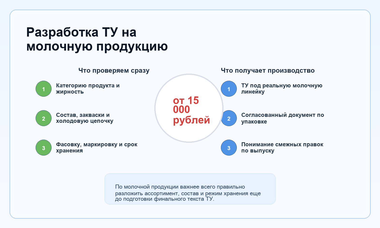По этой категории мы собираем документ так, чтобы он держал сразу несколько чувствительных зон: состав, жирность, упаковку, холодовую цепочку и маркировку. Иначе документ будет формально существовать, но работать в ежедневной операционке не сможет.